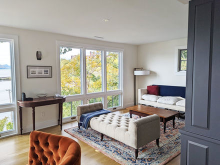 This renovated craftsman bungalow with an addition sits on a steep slope with great views of the Hudson River. The Cottage on Hudson has an amazing stair tower overlooking the river with lots of gardens and levels of terrace.