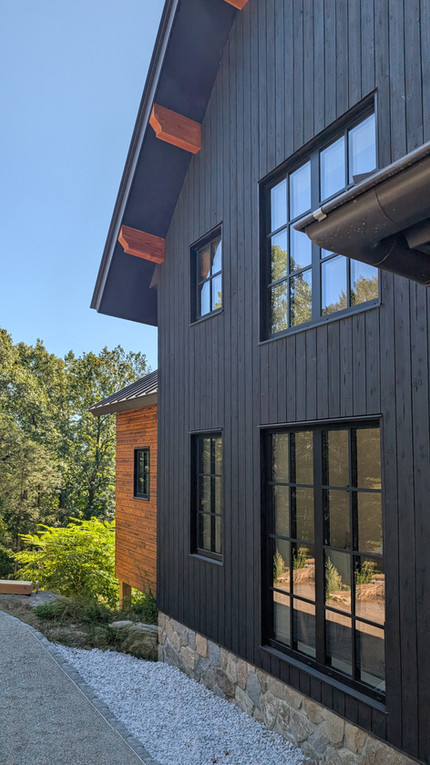 Designed as a forever home with aging in place top of mind, the house is single story, but has an expansive front to back great room with two-story windows, creating a feeling of living amongst the treetops. Conceived as a mountain home with modern flair, wood timber trusses lend character and warmth to the space. A deck wraps around the sides, ending in a screened porch. There’s also a woodworking studio insulated for noise and the space above the garage will have a kitchen and bathroom so it can be used as an office or guest suite.