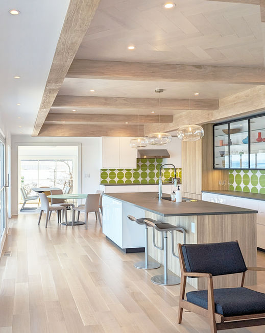 Sophisticated empty nesters enlisted us to transform their 1950s French country style house into a home that better matched their modern design sensibilities. White shiplap vaulted ceilings lend a beachy vibe, while the music room, with its steep pyramid-shaped roof and arched dormers, is one of the family's favorite additions to the house. The uniquely shaped space also has wonderful acoustics, ideal for enjoying music played on the grand piano.